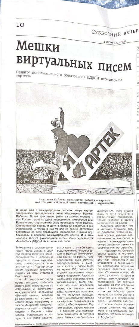 Совсем недавно руководитель школы журналистики «MediaStar» Анастасия Кайкова вернулась с Международного детского центра «Артек». В задачу Анастасии Сергеевны входило кураторство ребят - постовиков и фотографов, которые освещали Международную военно - историческую ассамблею «Вечный огонь». Делегация из 15 юных журналистов отправилась в Артек, чтобы стать первыми представителями Ассамблеи в социальных сетях детского центра и СМИ России. Кроме того Анастасия Кайкова писала и публиковала собственные посты на официальных сайтах Ассамблеи и социальных сетях Крыма.